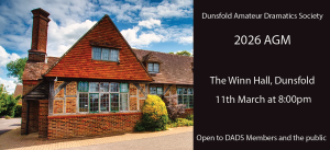 - D.A.D.S 2026 AGM AnnouncementThe next Dunsfold Amateur Dramatic Society Annual General Meeting will be held on Wednesday 11th March 2026 in the Nugent Room at the Winn Hall. The Chair will start proceedings at 8 pm so please arrive by 7.50 pm if possible. All D.A.D.S. members are invited to attend, plus members of the public too are also welcome. The annual membership will also be due at this time – it is still £5.00 per person which we think does still represent excellent value and offers vital support for your local amateur dramatic society. The membership runs from 1st April until 31st… Read more: D.A.D.S 2026 AGM Announcement